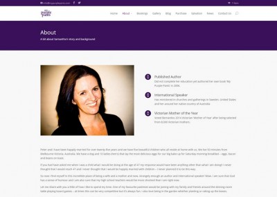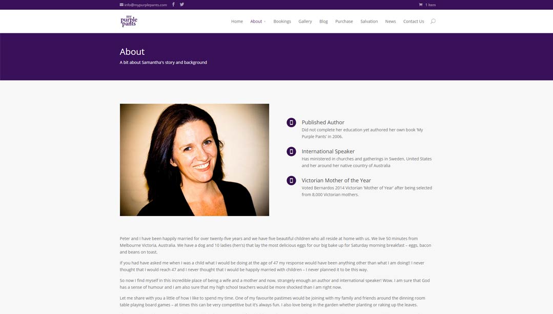 This multi-page website details the journey of a woman from the wounds of child abuse to adulthood. The book ‘My Purple Pants’ can be purchased from the site and it is linked to Paypal for transactions. It contains mixed media (video/blog/images). The client was trained in using their new website and they now administer the site alone.